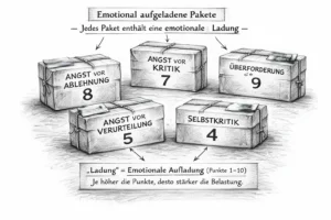 Zum Beispiel: Bei einer Person landet im inneren „Topf“ immer wieder das Paket „Angst, die eigene Meinung nicht vertreten zu können“. Sie nimmt sich dann vor, ihre Meinung häufiger zu äußern und zu vertreten. Dadurch kann die Ladung dieses Pakets mit der Zeit abnehmen oder es wird seltener aktiviert. Gleichzeitig kann das Vertreten der eigenen Meinung jedoch ein anderes Paket aktivieren, nämlich die „Angst, abgelehnt zu werden“. Dieses Paket war zuvor vielleicht kaum spürbar oder wurde nur schwach aktiviert. So kann es sein, dass eine Belastung geringer wird, während eine andere stärker in den Vordergrund tritt.