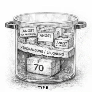 Der Mechanismus bei Typ B ist grundsätzlich ähnlich, aber die Panik entsteht nicht primär deshalb, weil aktuell allgemein „zu viel“ in den Topf gelangt. Sie entsteht vielmehr dadurch, dass sich ein verborgenes, großes Paket, das schon lange im Topf steckt, aktiviert und seine emotionale Aufladung „aufbricht“, ohne jedoch verarbeitet zu werden (die emotionale Ladung verschwindet erst dann, wenn sie aufgearbeitet ist).