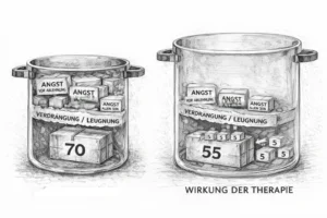 Wenn der innere Topf am Anfang z. B. ein Volumen von 100 hatte, kann er durch Therapie sinnbildlich auf 140 wachsen. Dieselbe Belastung wird dann als weniger bedrohlich erlebt.